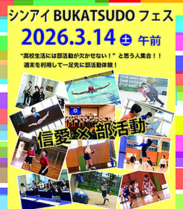 2026.01.15 入試情報 部活動フェス!(オープンキャンパス) 3月14日(土)部活動フェス開催! 今年は全ての部活が参加します!(体験・見学・展示等) 今年も中学2年生・1年生対象の「部活動フェス」を開催!今年はなんと、全ての部活動が参加します。少しでも気になる部活動があれば、ぜひ体験・見学へ。全ての部活動を見られるチャンスは今だけ!この機会に、自分にぴったりの部活動を見つけてください。皆さんの申込みをお待ちしています。 お申込みは1月21日(水)8:00~3月10日(火)18:00まで